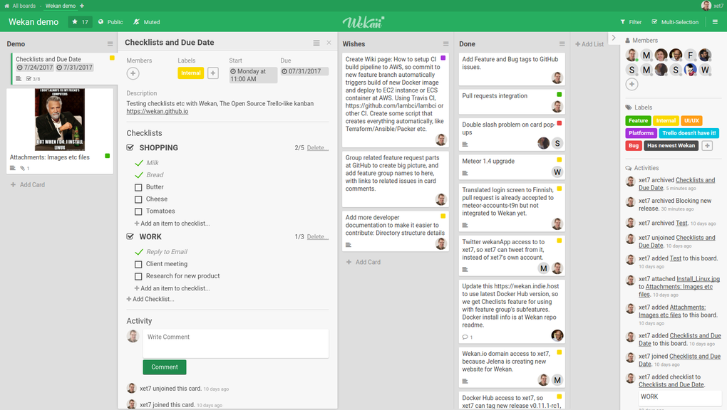 Los creadores de Wekan no tienen ningún tipo de problema en reconocer abiertamente la clara inspiración que han tenido a la hora de crear su programa. Juegan en la liga del código abierto y esto les permite una flexibilidad importante a la hora de sincerarse dentro de la industria, algo que otras empresas que han copiado a Trello no han hecho por motivos obvios. A la hora de la verdad este programa rinde muy bien y dispone de una interfaz que se parece a la del software en el que se inspira, pero con un cambio de color y de colocación de algunos de los elementos.
